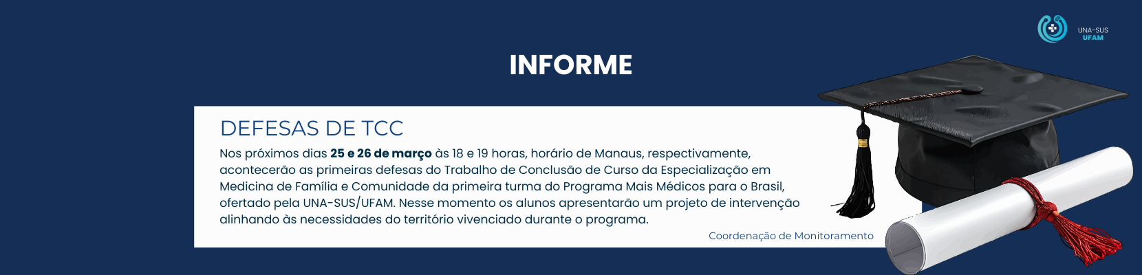 Nos próximos dias 25 e 26 de março às 18 e 19 horas, horário de Manaus, respectivamente, acontecerão as primeiras defesas do Trabalho de Conclusão do Curso da Especialização em Medicina de Família e Comunidade da primeira turma do Programa Mais Médicos para o Brasil, oferecido pela UNA-SUS/UFAM. Nesse momento os alunos apresentam um projeto de intervenção alinhando às necessidades do território vivenciado durante o programa.